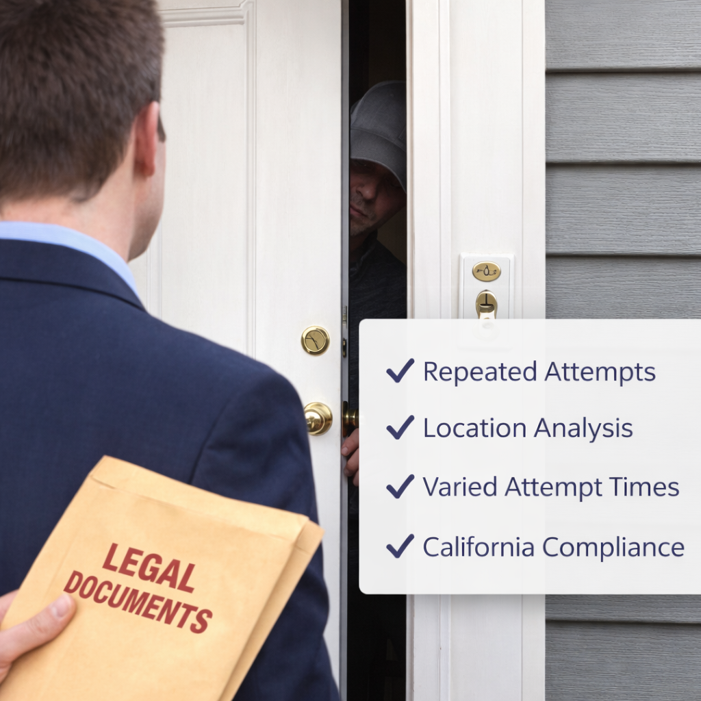 Instead of repeated unsuccessful attempts, we apply lawful, documented, and methodical service strategies designed for evasive individuals — including varied attempt times, location analysis, and compliance with California service rules.