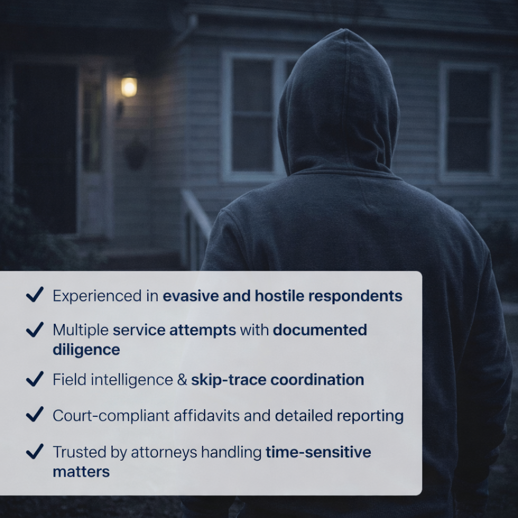 Serving a respondent who actively avoids service requires experience, strategy, and strict legal compliance.